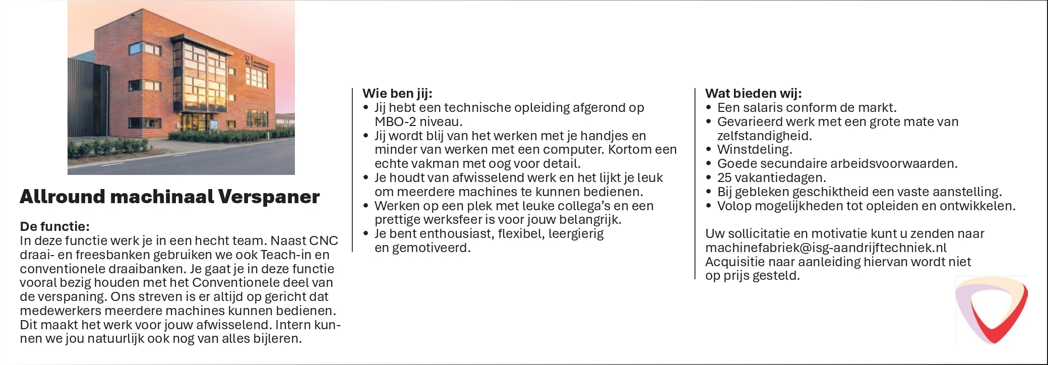 In deze functie werk je in een hecht team. Naast CNC draai- en freesbanken gebruiken we ook Teach-in en conventionele draaibanken. Je gaat je in deze functie vooral bezig houden met het Conventionele deel van de verspaning. Ons streven is er altijd op gericht dat medewerkers meerdere machines kunnen bedienen. Dit maakt het werk voor jouw afwisselend. Intern kunnen we jou natuurlijk ook nog van alles bijleren.