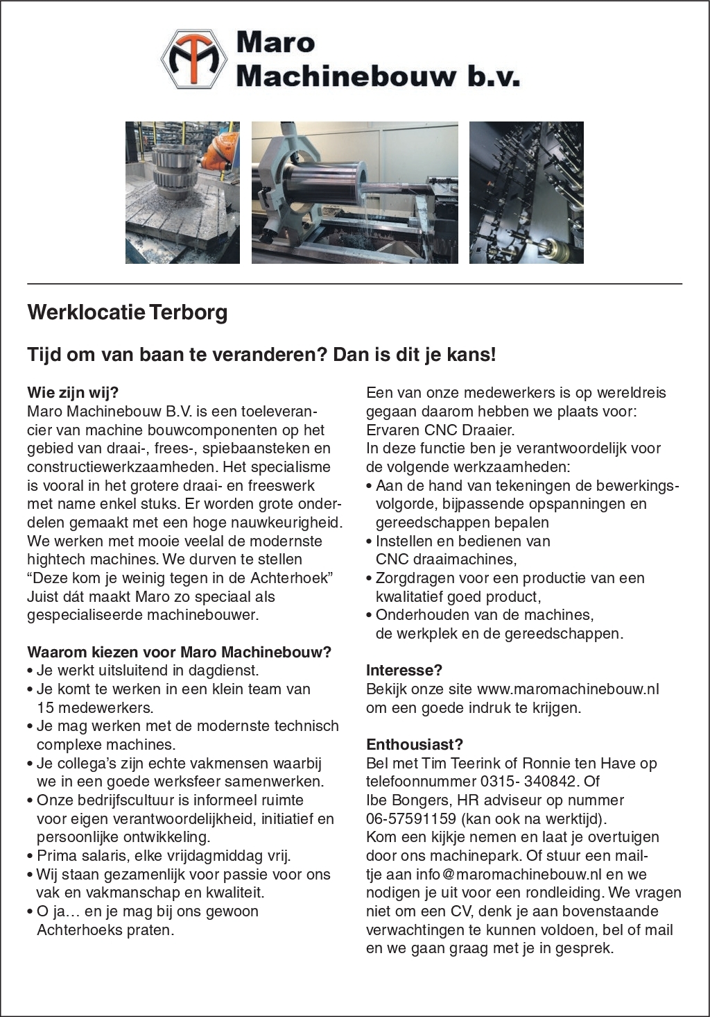 Maro Machinebouw BV is een toeleverancier van machine bouwcomponenten op het gebied van draai-, frees-, spiebaansteken en constructiewerkzaamheden. Het specialisme is vooral in het grotere draai- en freeswerk met name enkel stuks. Er worden grote onderdelen gemaakt met een hoge nauwkeurigheid. We werken met mooie veelal de modernste hightech machines. We durven te stellen "Deze kom je weinig tegen in de Achterhoek". Juist dát maakt Maro zo speciaal als gespecialiseerde machinebouwer.