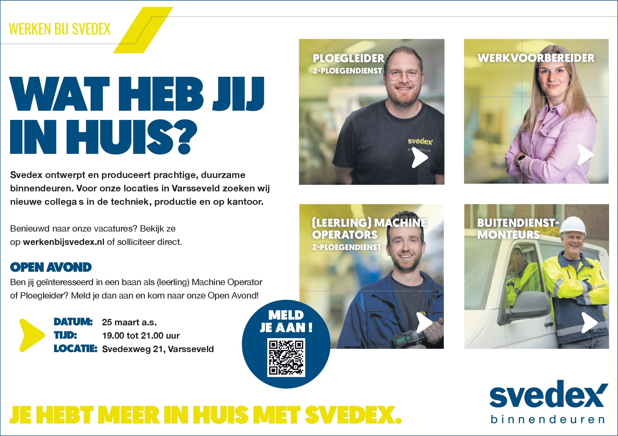 Bij Svedex ontwerpen, ontwikkelen en produceren we schitterende, duurzame binnendeuren. Met een team van ruim 300 vakmensen en een moderne productielocatie hebben we alles in huis om interieurs in het hele land net iets mooier te maken. En behalve dat we daar veel plezier in hebben, zijn we er ook nog eens heel goed in. Dat heeft bouwend en renoverend Nederland ook gezien, dus we hebben het druk! Daarom hebben we meer teamleden nodig.